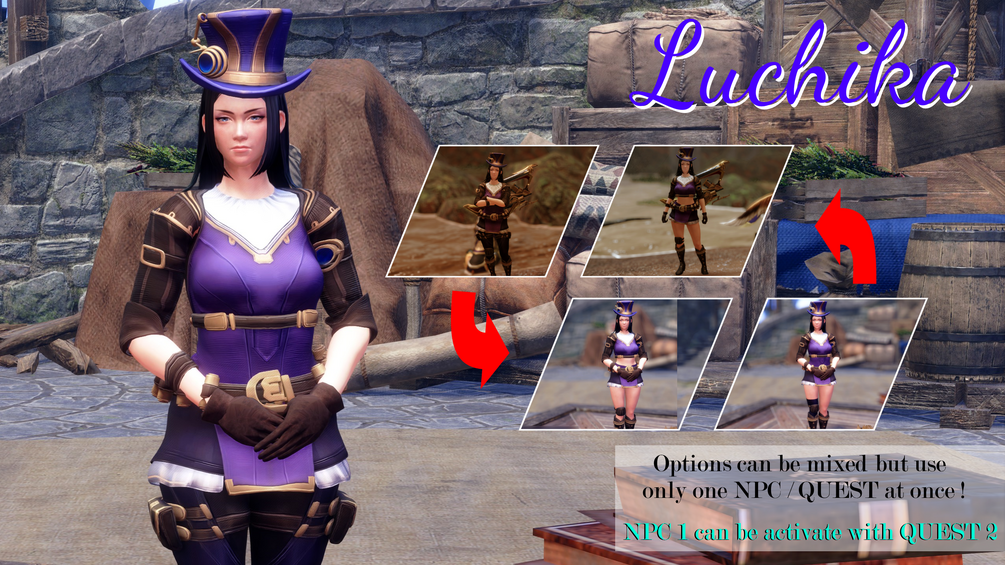 This dress is made to replace Luchika's armour QUEST (pl601) and NPC (npc615_00), remember, you must install